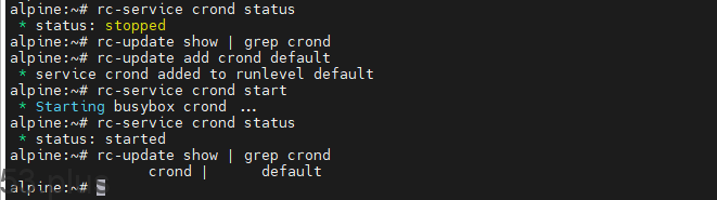 通过命令crontab -l看到存在一些计划任务,但实际这些计划任务并不会如期运行。alpine默认状态crond不会开机自启,使用rc-service crond status查看状态,可看到处于停止状态。可以使用以下命令启动crond,并加入开机自启