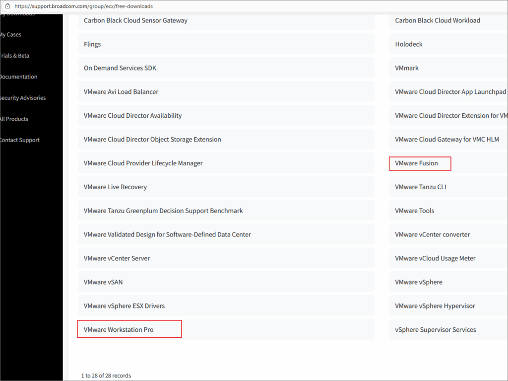 然后打开https://support.broadcom.com/group/ecx/free-downloads,这个区域是下载免费产品的,找到VMware Workstation Pro或者VMware Fusion点击进去